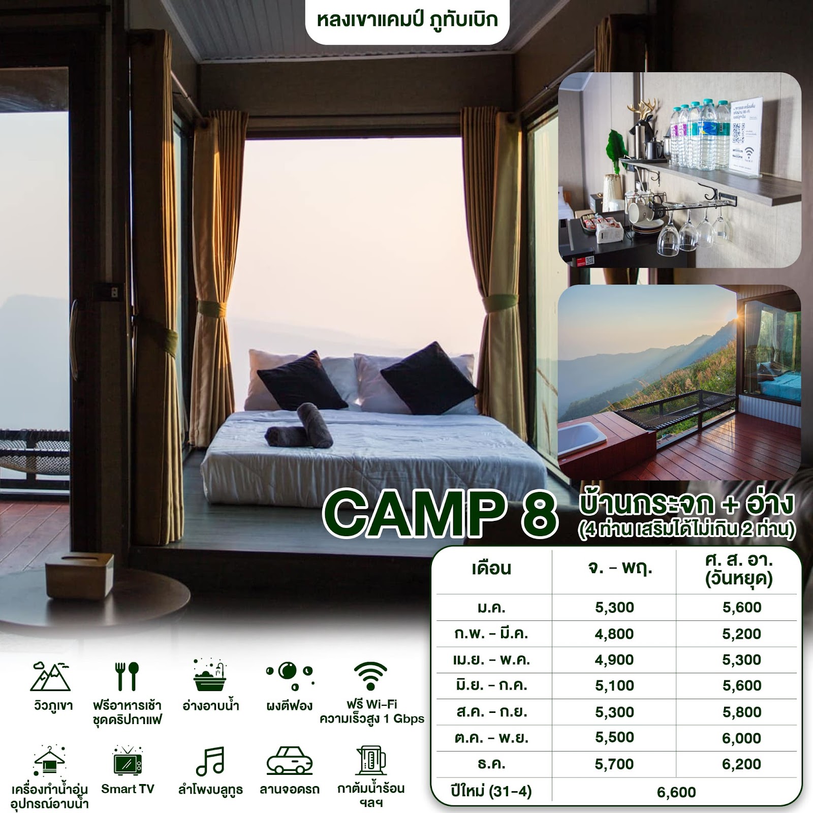บ้านกล่องขาว Camp 8 {fullWidth}Camp 8 : บ้านกล่องขาว VIP สำหรับ 4 ท่าน + อ่าง (เสริมได้ไม่เกิน 2 ท่าน) (วิวหน้าผา, ทะเลหมอก)✅อ่างแช่ตัวน้ำอุ่น ✅ระเบียงวิวหน้าผา, ทะเลหมอก ✅ห้องน้ำส่วนตัว ✅อาหารเช้า